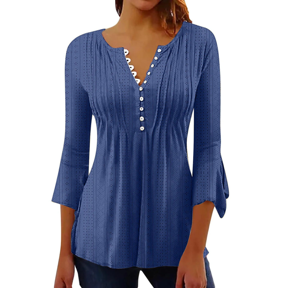 Saashi V-Neck Hollow Out Blouse for Women 3/4 Sleeve Solid Tunic Shirt Casual Office Wear