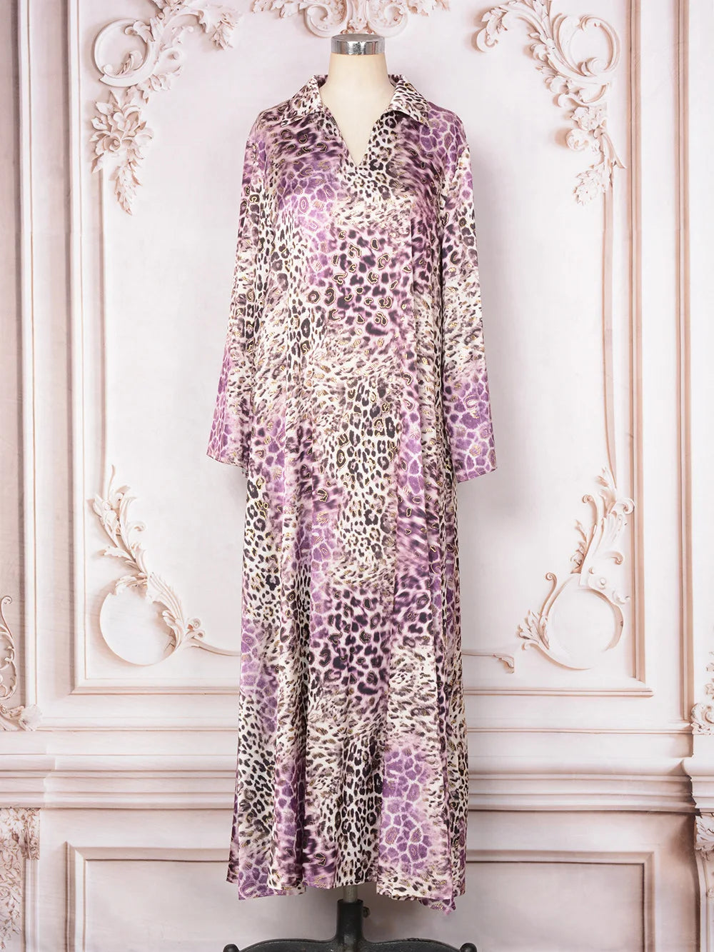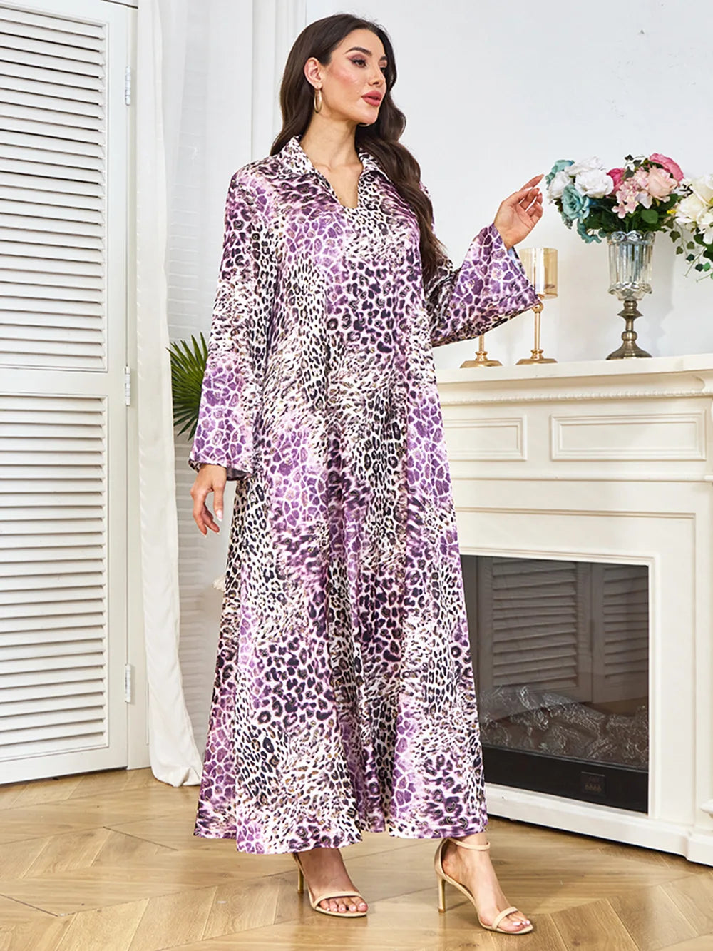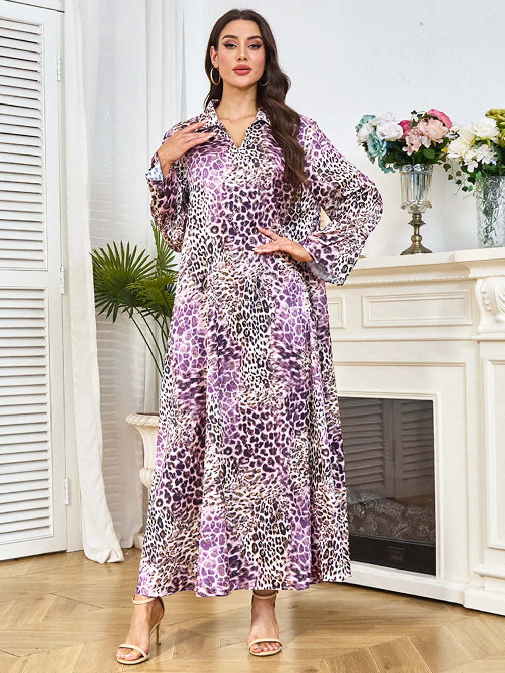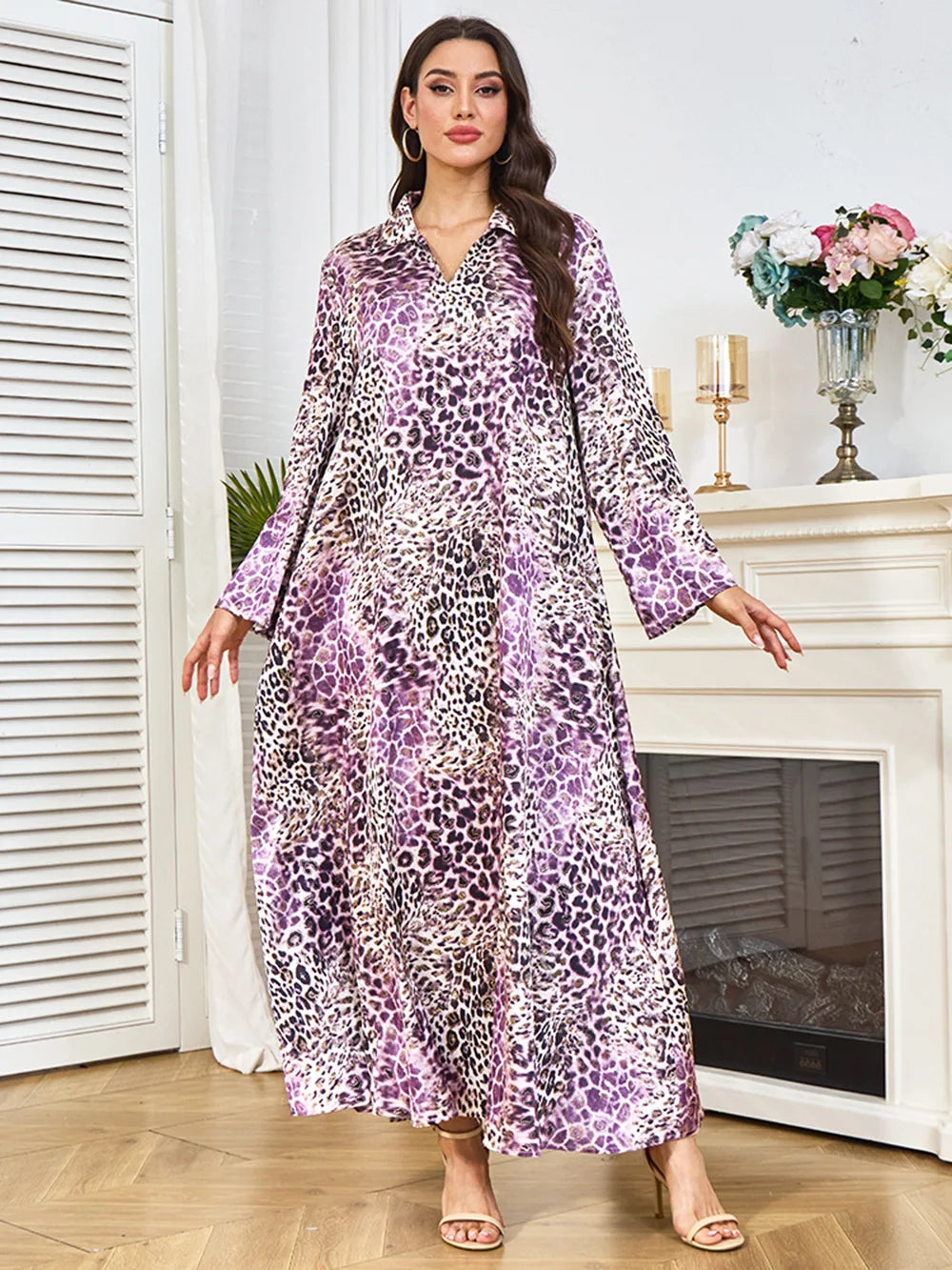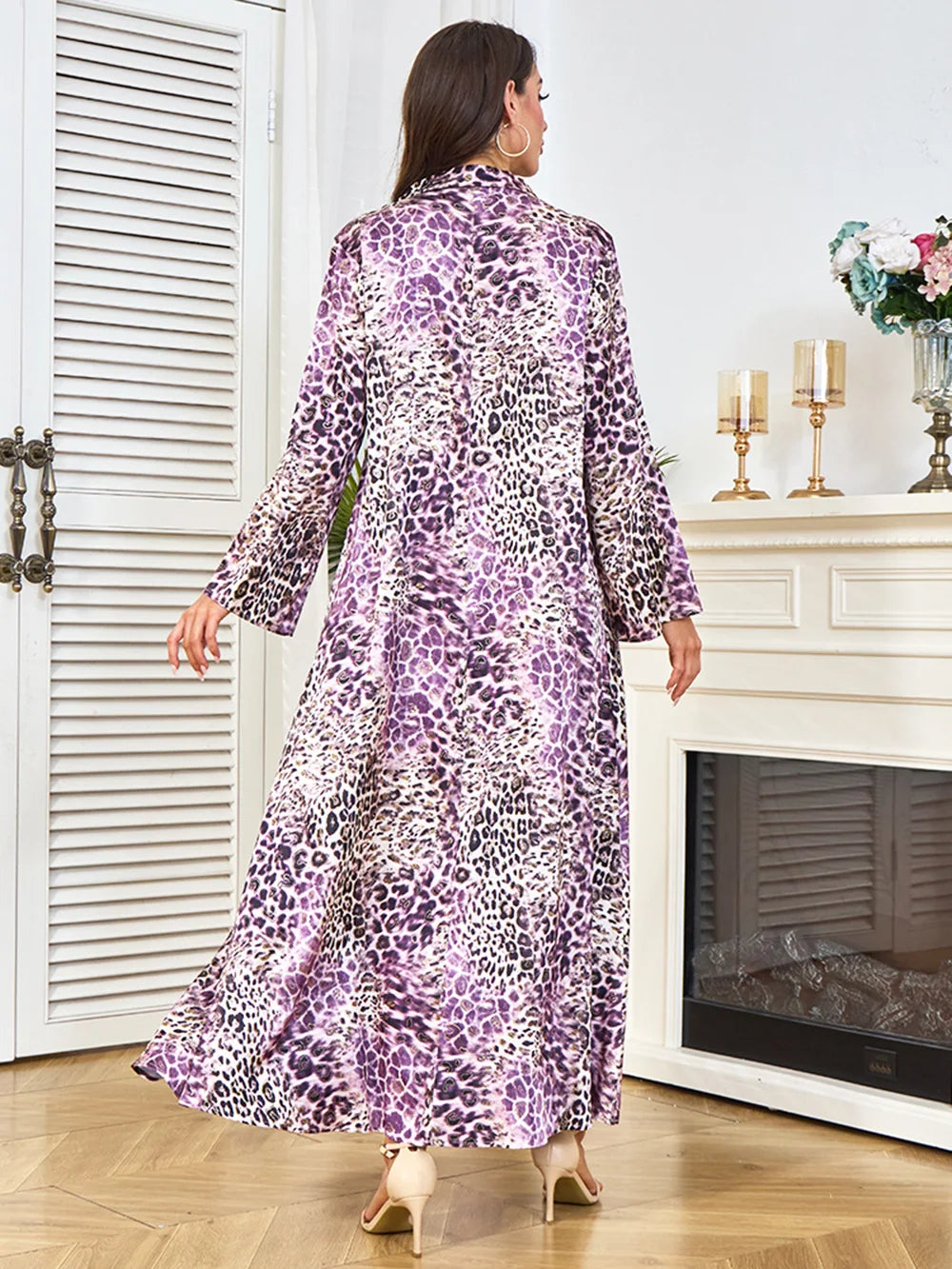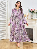 Saashi Eid Party Abaya Dress for Women Muslim Long Sleeve Leopard Print Kaftan Robe