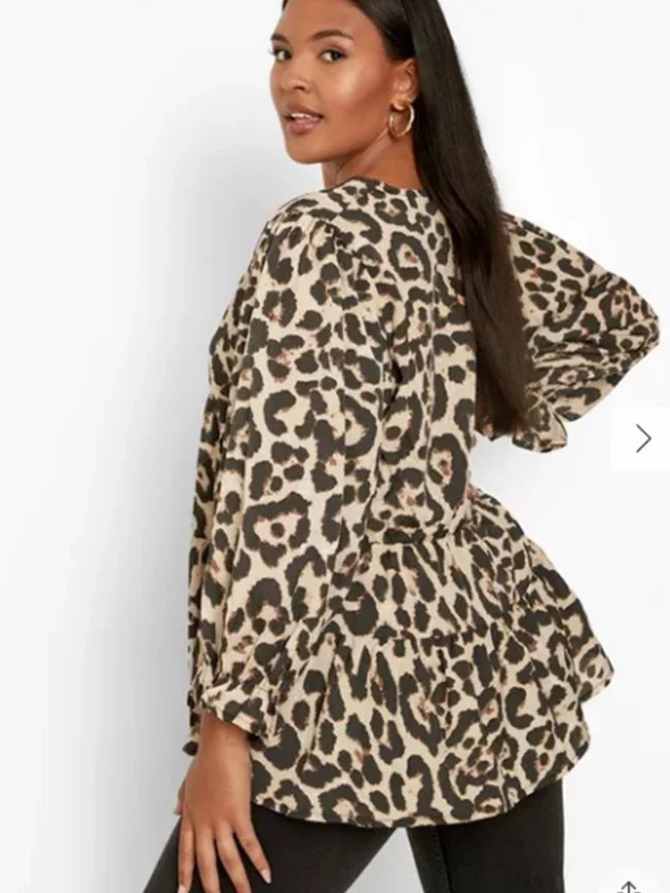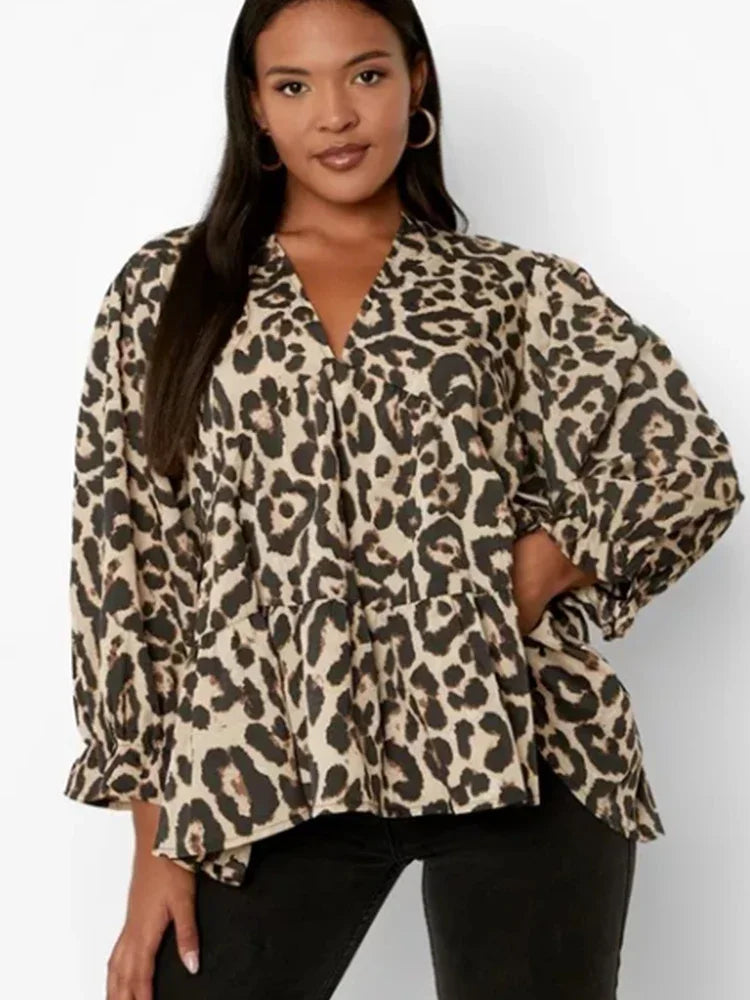 Saashi Plus Size Leopard Print V-Neck Blouse for Women with Ruffle Hem and Lantern Sleeves