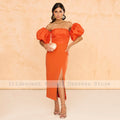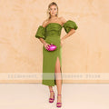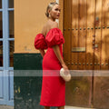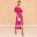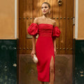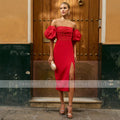 Saashi Red Off Shoulder Pleated Midi Dress – Elegant Sheath Column Gown for Women Parties