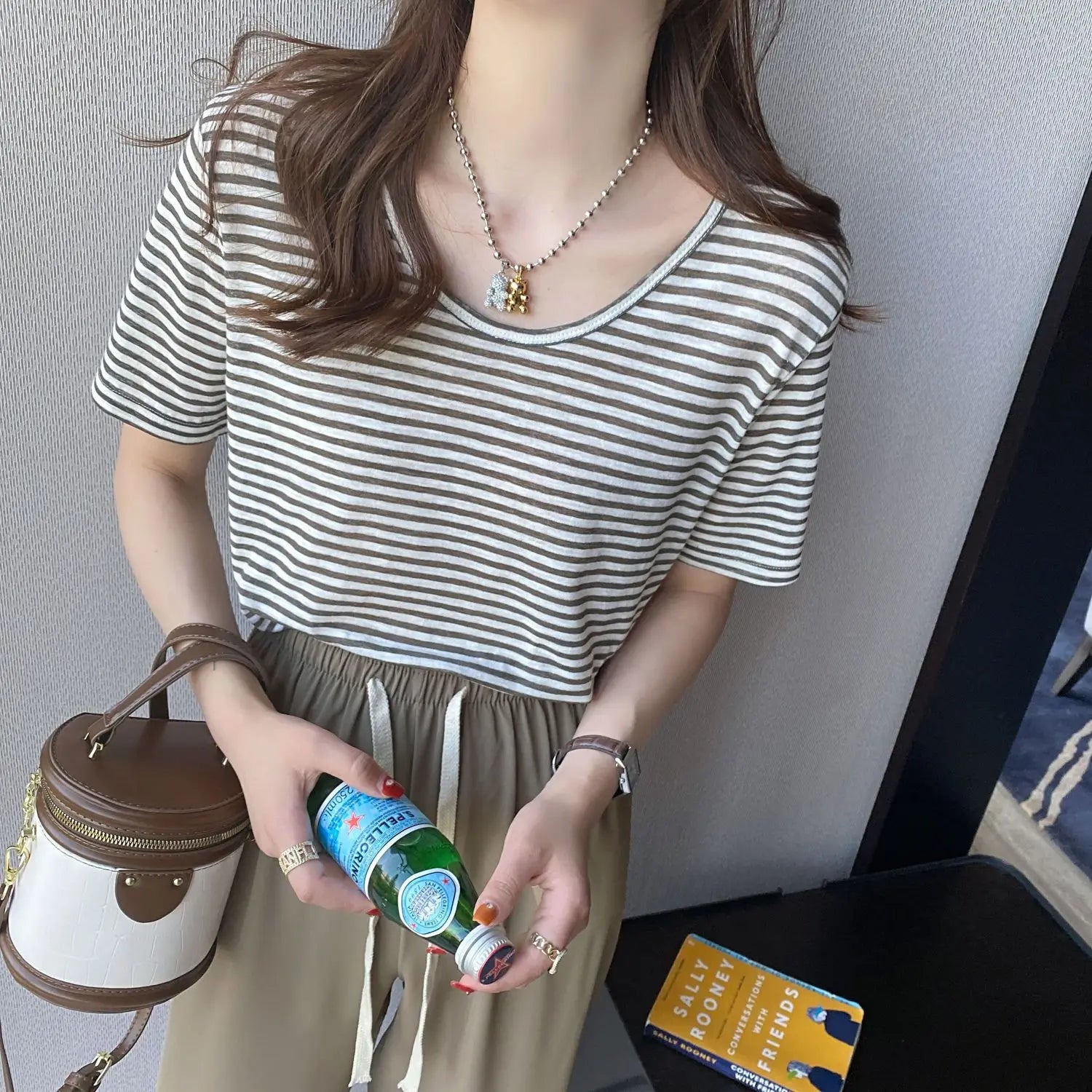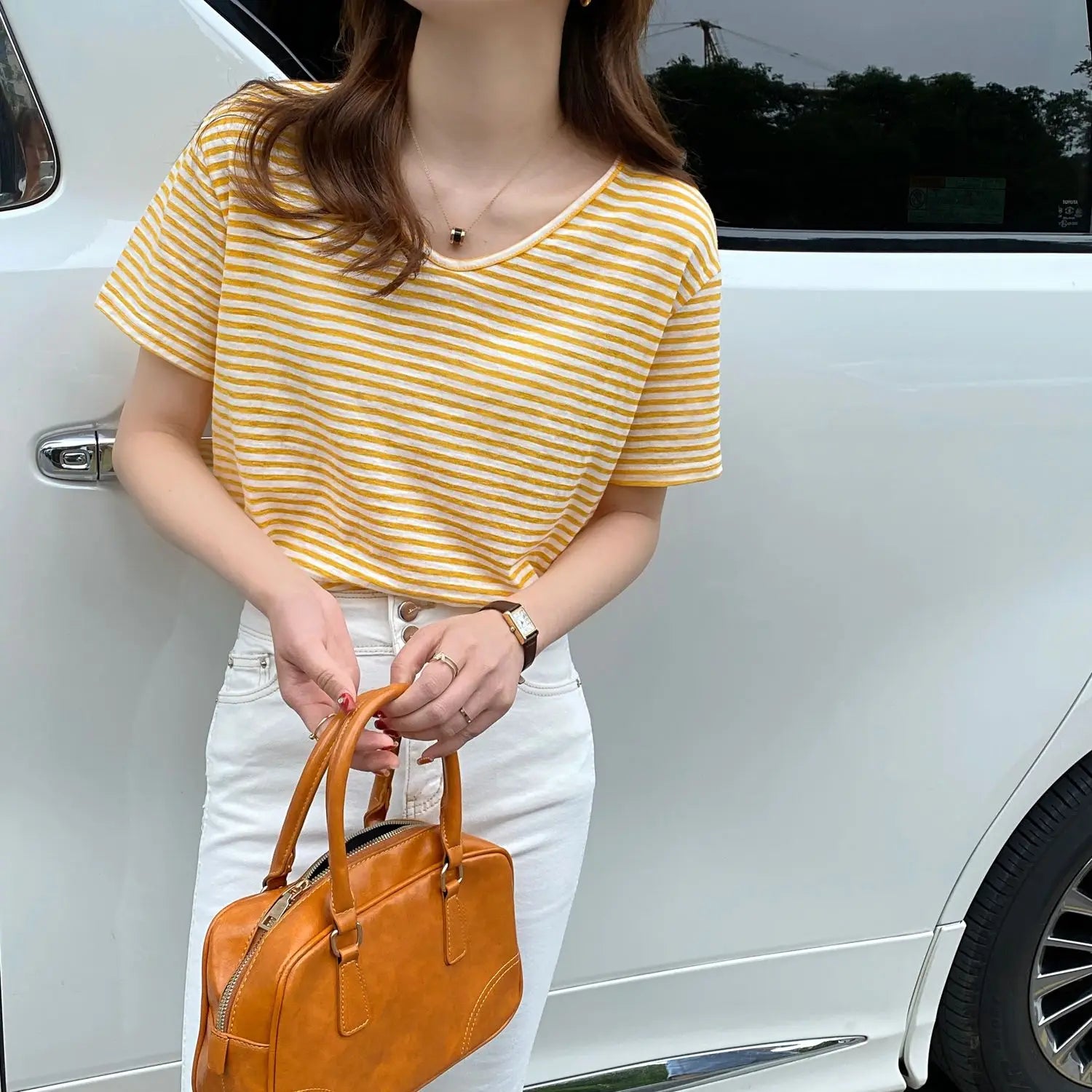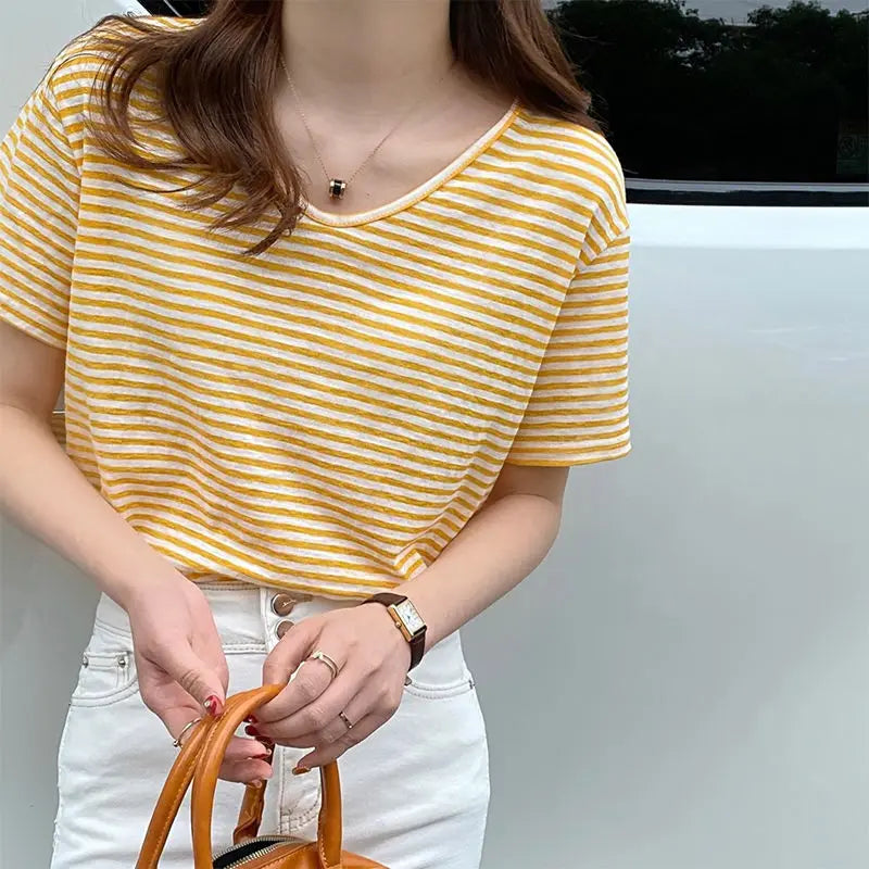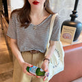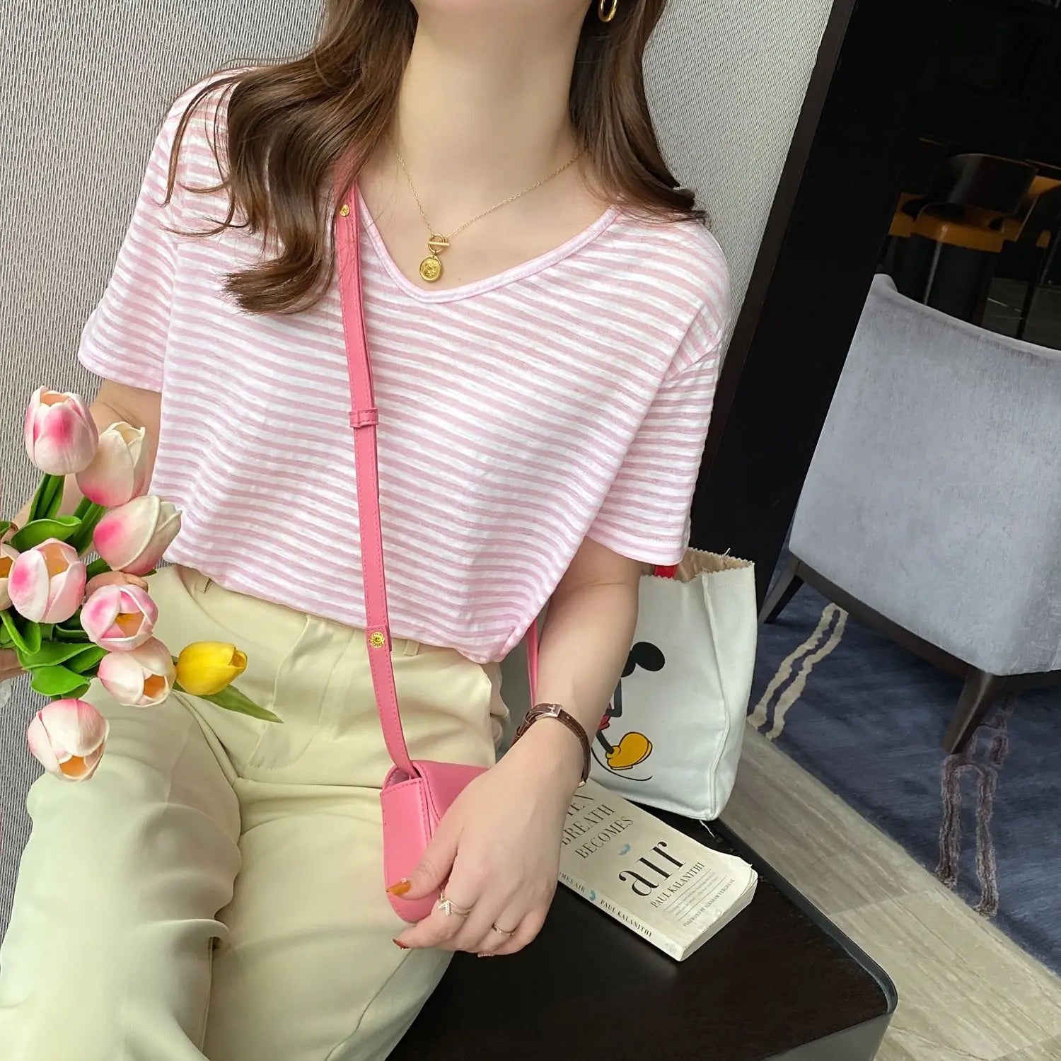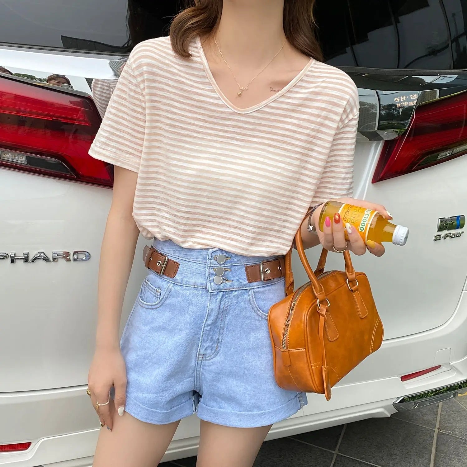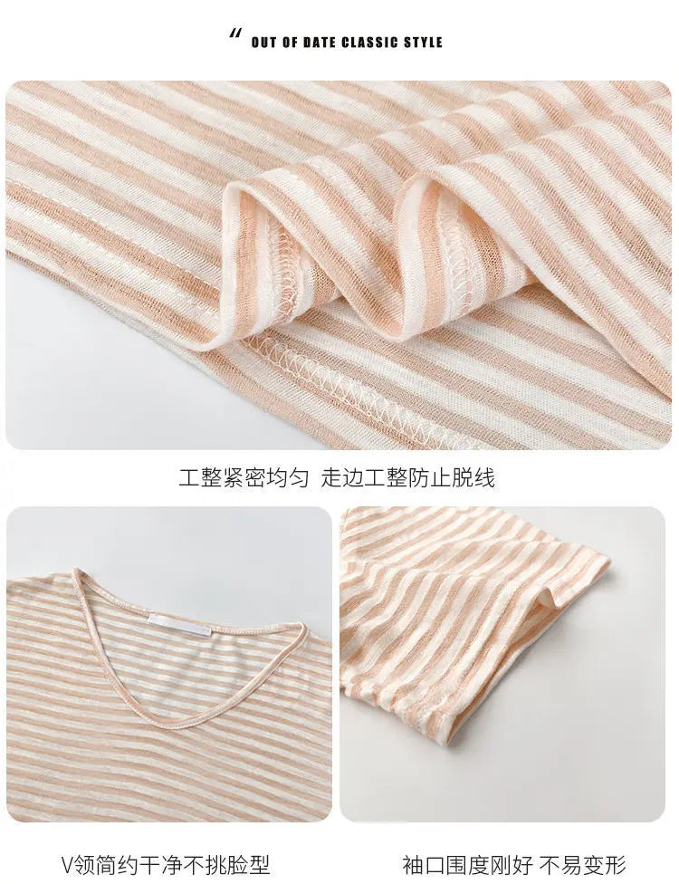 Saashi Striped Short Sleeve V-Neck Top – Loose Thin Style Ice Silk Cotton Linen Blouse for Women