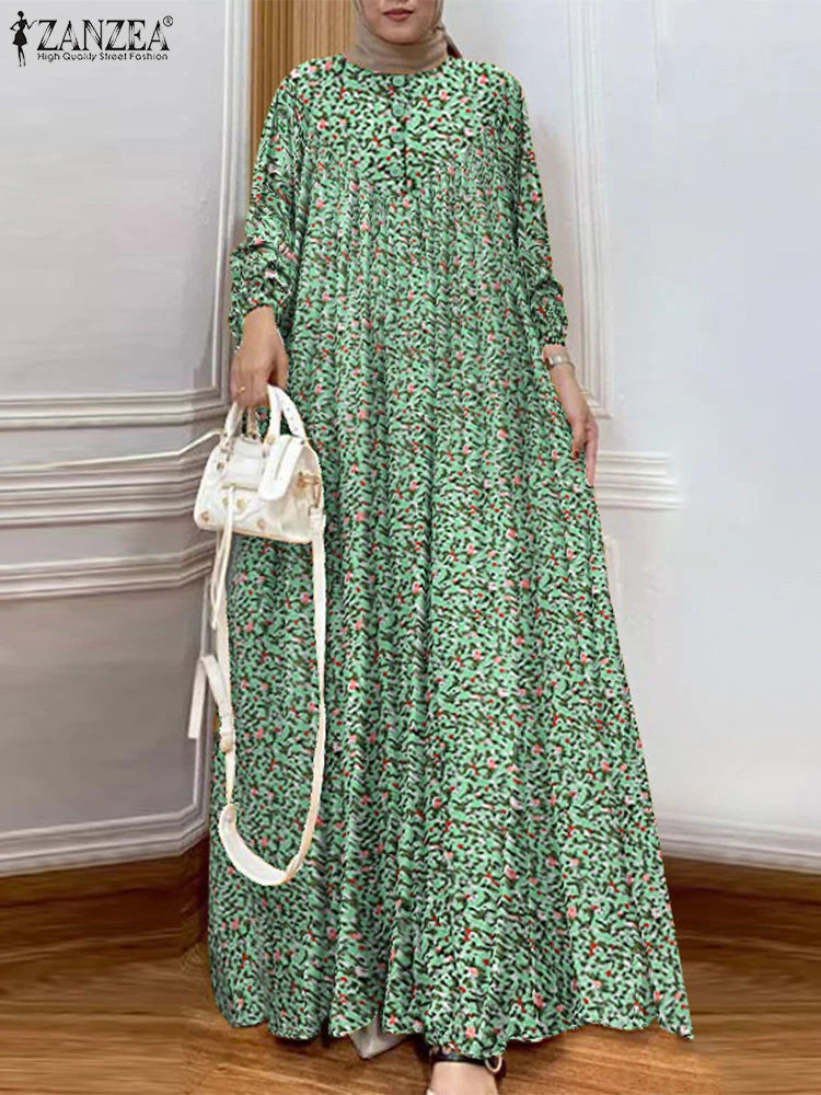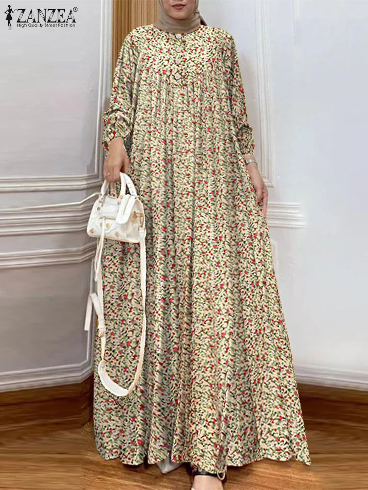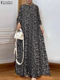 Saashi Vintage Printed Muslim Abaya Dress for Women Long Sleeve Hijab Sundress Ramadan Wear