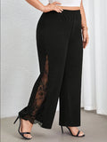 Saashi Plus Size Black Wide Leg Pants for Women with Lace Patchwork and Elastic Waist